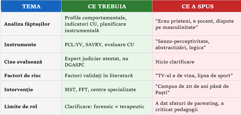 „Este important să distingem: DGASPC face evaluare pentru stabilirea măsurilor de protecție — nu evaluare a periculozității sau risc de recidivă. Pentru un omor, este obligatorie expertiza psihologică judiciară realizată de expert atestat. Sunt proceduri diferite, cu scopuri diferite.”